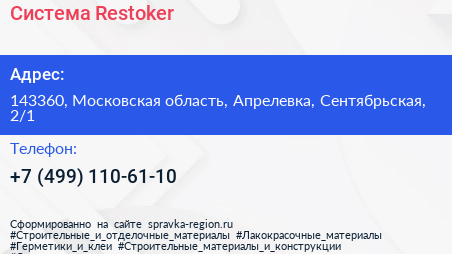 Система Restoker по адресу 143360, Московская область, Апрелевка, Сентябрьская, 2/1 в дальнейшем Организация, размещена в следующих категориях: