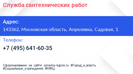 Служба сантехнических работ по адресу 143362, Московская область, Апрелевка, Садовая, 1 в дальнейшем Организация, размещена в следующих категориях: