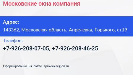 Московские окна, компания по адресу 143362, Московская область, Апрелевка, Горького, ст19 в дальнейшем Организация, размещена в следующих категориях: