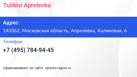 Tulikivi-Aprelevka по адресу 143362, Московская область, Апрелевка, Калиновая, 6 в дальнейшем Организация, размещена в следующих категориях: