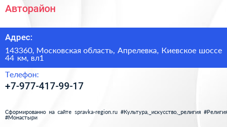 Авторайон по адресу 143360, Московская область, Апрелевка, Киевское шоссе 44 км, вл1 в дальнейшем Организация, размещена в следующих категориях: