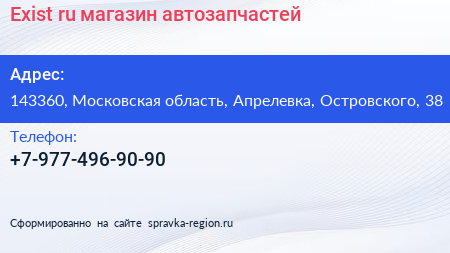 Exist.ru, магазин автозапчастей по адресу 143360, Московская область, Апрелевка, Островского, 38 в дальнейшем Организация, размещена в следующих категориях: