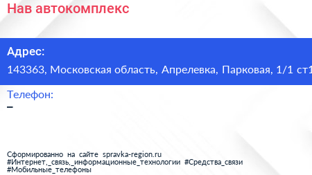 Нав, автокомплекс по адресу 143363, Московская область, Апрелевка, Парковая, 1/1 ст1 в дальнейшем Организация, размещена в следующих категориях: