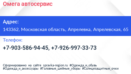 Омега, автосервис по адресу 143362, Московская область, Апрелевка, Апрелевская, 65 в дальнейшем Организация, размещена в следующих категориях: