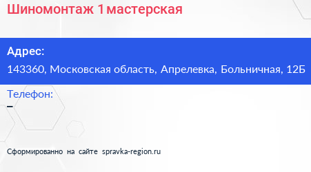 Шиномонтаж №1, мастерская по адресу 143360, Московская область, Апрелевка, Больничная, 12Б в дальнейшем Организация, размещена в следующих категориях:
