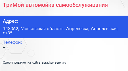 ТриМой, автомойка самообслуживания по адресу 143362, Московская область, Апрелевка, Апрелевская, ст85 в дальнейшем Организация, размещена в следующих категориях: