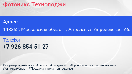 Фотоникс Технолоджи по адресу 143362, Московская область, Апрелевка, Апрелевская, 65а в дальнейшем Организация, размещена в следующих категориях: