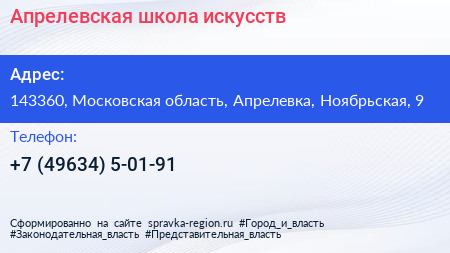 Апрелевская школа искусств по адресу 143360, Московская область, Апрелевка, Ноябрьская, 9 в дальнейшем Организация, размещена в следующих категориях: