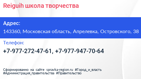 Reiguih, школа творчества по адресу 143360, Московская область, Апрелевка, Островского, 38 в дальнейшем Организация, размещена в следующих категориях: