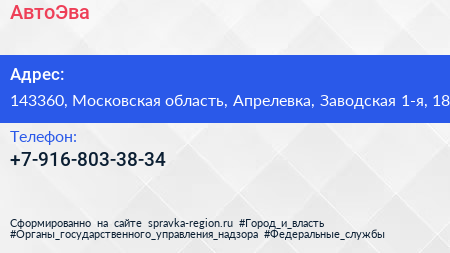 АвтоЭва по адресу 143360, Московская область, Апрелевка, Заводская 1-я, 18 в дальнейшем Организация, размещена в следующих категориях: