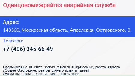 Одинцовомежрайгаз, аварийная служба по адресу 143360, Московская область, Апрелевка, Островского, 3 в дальнейшем Организация, размещена в следующих категориях: