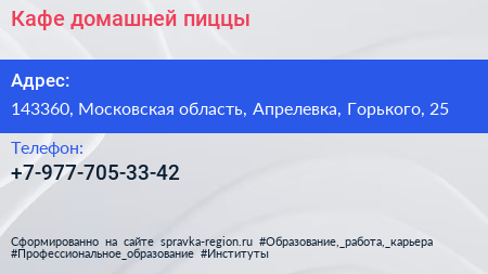 Кафе домашней пиццы по адресу 143360, Московская область, Апрелевка, Горького, 25 в дальнейшем Организация, размещена в следующих категориях: