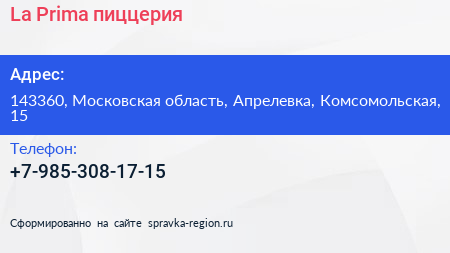 La Prima, пиццерия по адресу 143360, Московская область, Апрелевка, Комсомольская, 15 в дальнейшем Организация, размещена в следующих категориях: