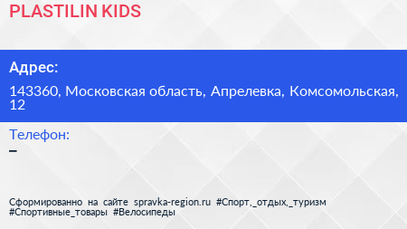 PLASTILIN KIDS по адресу 143360, Московская область, Апрелевка, Комсомольская, 12 в дальнейшем Организация, размещена в следующих категориях: