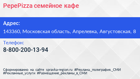 PepePizza, семейное кафе по адресу 143360, Московская область, Апрелевка, Августовская, 8 в дальнейшем Организация, размещена в следующих категориях: