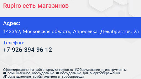 Rupiro, сеть магазинов по адресу 143362, Московская область, Апрелевка, Декабристов, 2а в дальнейшем Организация, размещена в следующих категориях: