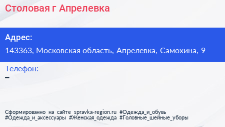 Столовая, г. Апрелевка по адресу 143363, Московская область, Апрелевка, Самохина, 9 в дальнейшем Организация, размещена в следующих категориях: