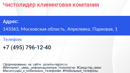 Чистолидер, клининговая компания по адресу 143363, Московская область, Апрелевка, Парковая, 1 в дальнейшем Организация, размещена в следующих категориях: