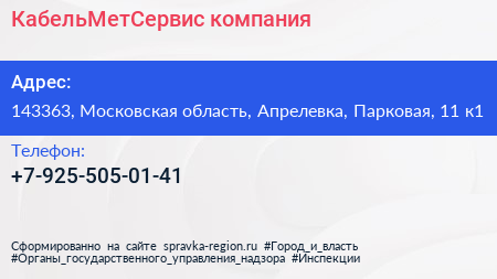 КабельМетСервис, компания по адресу 143363, Московская область, Апрелевка, Парковая, 11 к1 в дальнейшем Организация, размещена в следующих категориях:
