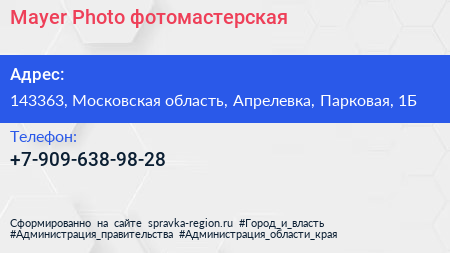 Mayer Photo, фотомастерская по адресу 143363, Московская область, Апрелевка, Парковая, 1Б в дальнейшем Организация, размещена в следующих категориях: