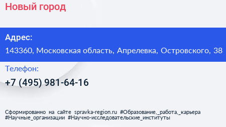 Новый город по адресу 143360, Московская область, Апрелевка, Островского, 38 в дальнейшем Организация, размещена в следующих категориях: