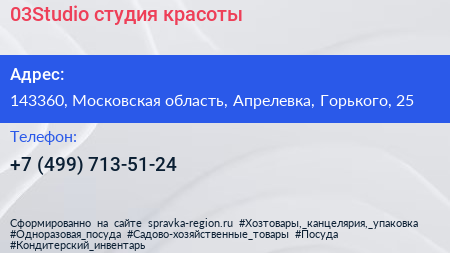 03Studio, студия красоты по адресу 143360, Московская область, Апрелевка, Горького, 25 в дальнейшем Организация, размещена в следующих категориях: