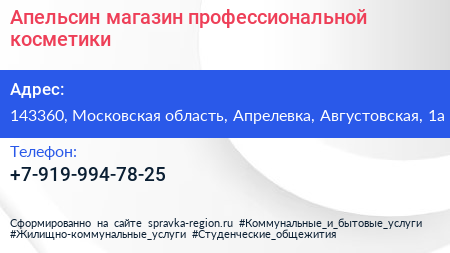 Апельсин, магазин профессиональной косметики по адресу 143360, Московская область, Апрелевка, Августовская, 1а в дальнейшем Организация, размещена в следующих категориях: