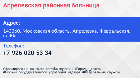 Апрелевская районная больница по адресу 143360, Московская область, Апрелевка, Февральская, вл40а в дальнейшем Организация, размещена в следующих категориях: