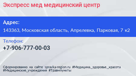 Экспресс-мед, медицинский центр по адресу 143363, Московская область, Апрелевка, Парковая, 7 к2 в дальнейшем Организация, размещена в следующих категориях: