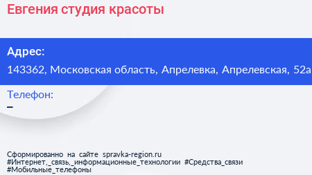 Евгения, студия красоты по адресу 143362, Московская область, Апрелевка, Апрелевская, 52а в дальнейшем Организация, размещена в следующих категориях: