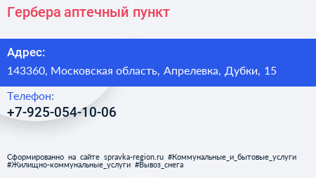 Гербера, аптечный пункт по адресу 143360, Московская область, Апрелевка, Дубки, 15 в дальнейшем Организация, размещена в следующих категориях: