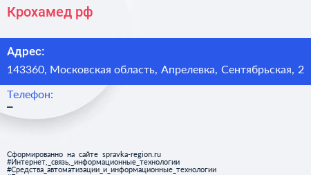 Крохамед.рф по адресу 143360, Московская область, Апрелевка, Сентябрьская, 2 в дальнейшем Организация, размещена в следующих категориях: