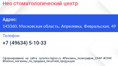 Нео, стоматологический центр по адресу 143360, Московская область, Апрелевка, Февральская, 49 в дальнейшем Организация, размещена в следующих категориях: