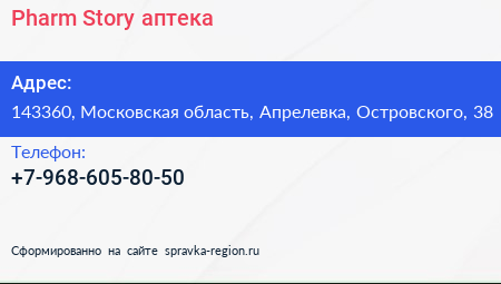 Pharm Story, аптека по адресу 143360, Московская область, Апрелевка, Островского, 38 в дальнейшем Организация, размещена в следующих категориях: