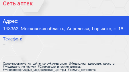 Сеть аптек по адресу 143362, Московская область, Апрелевка, Горького, ст19 в дальнейшем Организация, размещена в следующих категориях: