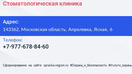 Стоматологическая клиника по адресу 143362, Московская область, Апрелевка, Ясная, 6 в дальнейшем Организация, размещена в следующих категориях: