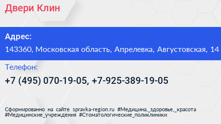 Двери Клин по адресу 143360, Московская область, Апрелевка, Августовская, 14 в дальнейшем Организация, размещена в следующих категориях: