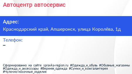 Автоцентр, автосервис по адресу Краснодарский край, Апшеронск, улица Королёва, 1д в дальнейшем Организация, размещена в следующих категориях: