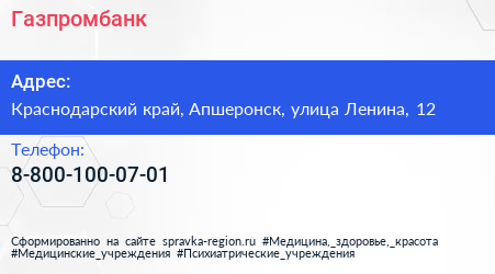 Газпромбанк по адресу Краснодарский край, Апшеронск, улица Ленина, 12 в дальнейшем Организация, размещена в следующих категориях: