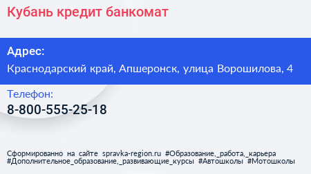 Кубань кредит, банкомат по адресу Краснодарский край, Апшеронск, улица Ворошилова, 4 в дальнейшем Организация, размещена в следующих категориях:
