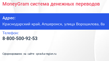 MoneyGram, система денежных переводов по адресу Краснодарский край, Апшеронск, улица Ворошилова, 8а в дальнейшем Организация, размещена в следующих категориях: