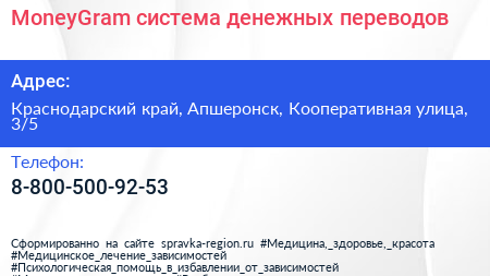 MoneyGram, система денежных переводов по адресу Краснодарский край, Апшеронск, Кооперативная улица, 3/5 в дальнейшем Организация, размещена в следующих категориях: