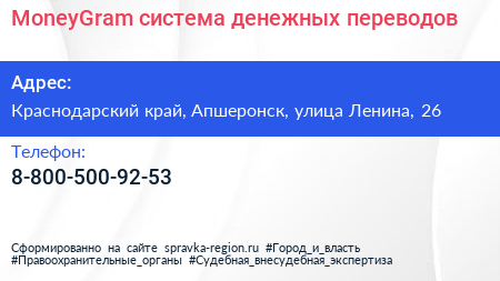 MoneyGram, система денежных переводов по адресу Краснодарский край, Апшеронск, улица Ленина, 26 в дальнейшем Организация, размещена в следующих категориях: