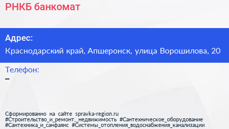 РНКБ, банкомат по адресу Краснодарский край, Апшеронск, улица Ворошилова, 20 в дальнейшем Организация, размещена в следующих категориях: