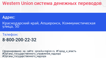 Western Union, система денежных переводов по адресу Краснодарский край, Апшеронск, Коммунистическая улица, 50 в дальнейшем Организация, размещена в следующих категориях: