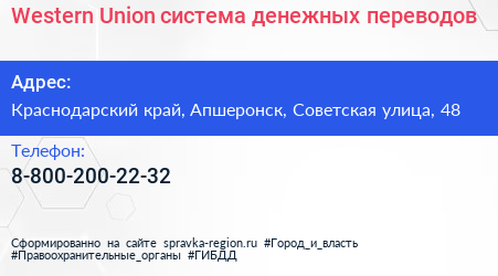 Western Union, система денежных переводов по адресу Краснодарский край, Апшеронск, Советская улица, 48 в дальнейшем Организация, размещена в следующих категориях: