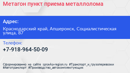 Метагон, пункт приема металлолома по адресу Краснодарский край, Апшеронск, Социалистическая улица, 87 в дальнейшем Организация, размещена в следующих категориях: