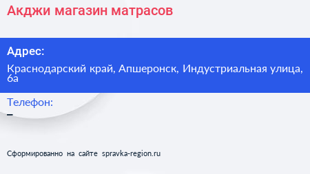Акджи, магазин матрасов по адресу Краснодарский край, Апшеронск, Индустриальная улица, 6а в дальнейшем Организация, размещена в следующих категориях: