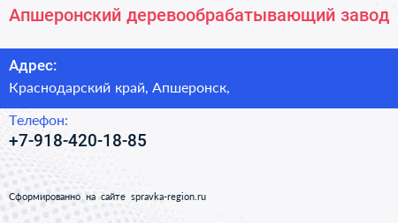 Апшеронский деревообрабатывающий завод по адресу Краснодарский край, Апшеронск, в дальнейшем Организация, размещена в следующих категориях: