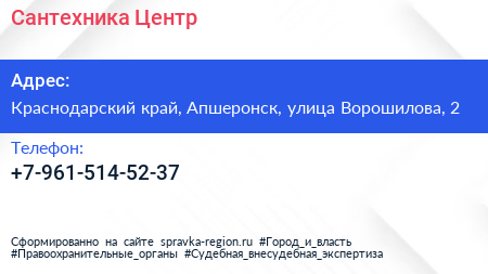 Сантехника-Центр по адресу Краснодарский край, Апшеронск, улица Ворошилова, 2 в дальнейшем Организация, размещена в следующих категориях: